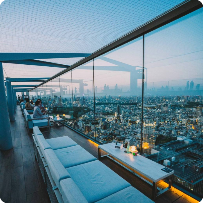Ascent to the Shibuya Sky observation deck, from where a dizzying view of Tokyo opens up.